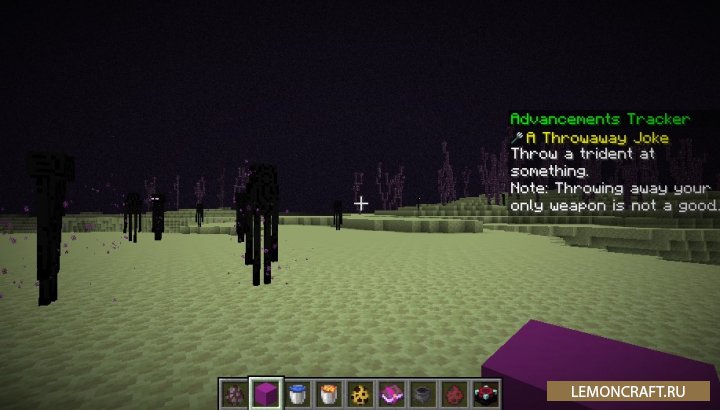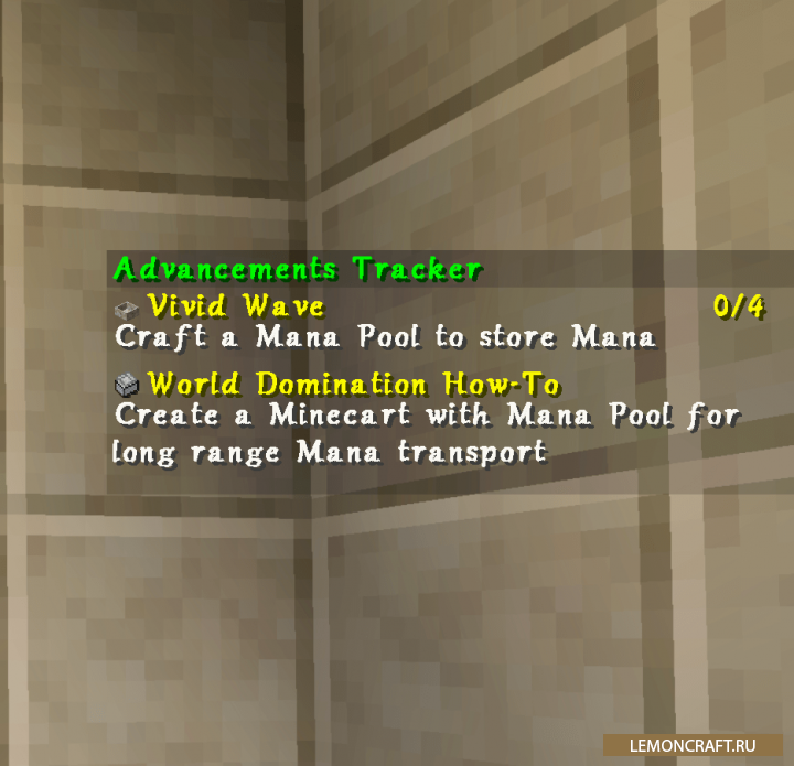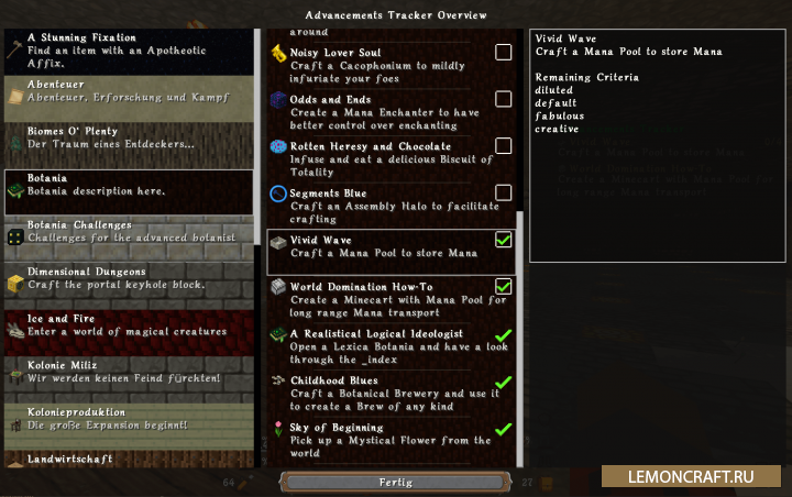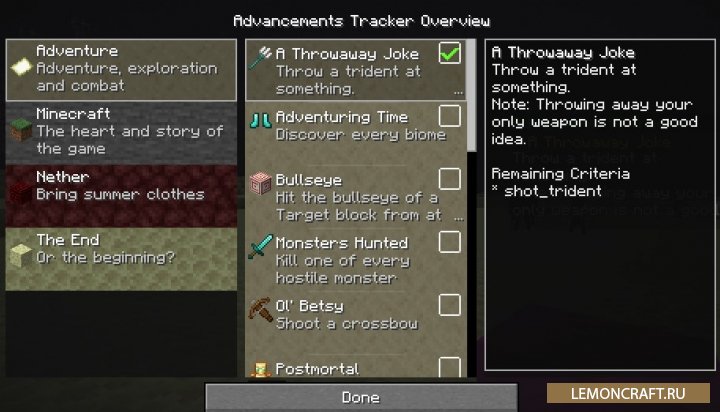 Мод на трекер достижений Advancements Tracker добавляет в игру трекер, аналогичный тому, который используется в РПГ играх и позволяет отображать в реальном времени прогресс ваших достижений. В настройках мода вы можете выбрать какие именно достижения отслеживать. Для вызова меню мода используйте комбинацию клавиш CTRL+L.